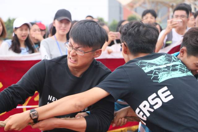 随着“嘟"的一声哨响,擂鼓声此起彼伏,绳子蹦得像一根铁棒一样,大家紧握麻绳,迈开弓箭步,使出浑身力气,集中注意力,劲往一处使,麻绳上的红布不断向两边徘徊着,力量与意志的较量开始了。现场同学的呐喊助威给比赛增添了一抹亮色,每一声呐喊都带来一股力量!