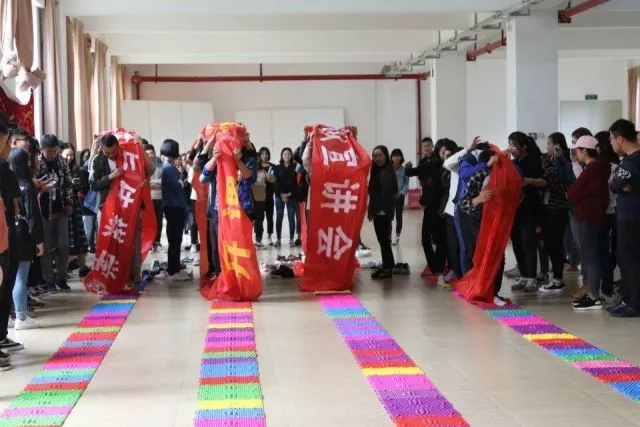 “无敌风火轮”风风火火,一块块红色条幅将大家连在一起,一边顶起红布,一边迈步向前,大家感受到了团结的力量。热情像那红布一样无限向上,脚底是指压板的突击,心里却是红布的温暖。