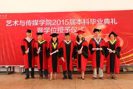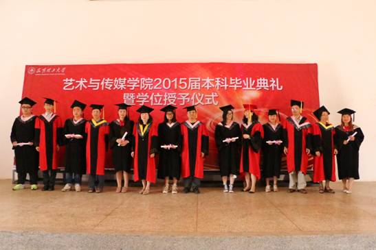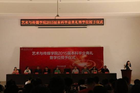 党委书记苏峰、院长许佳、副院长陈出云、副院长王勇、院长助理张建国、工业设计系系主任杨阳、新闻传播系系主任杨璐、视觉传达系系主任喻丽、环境艺术设计系系主任马云林、美术系系主任杨剑颖以及2015届毕业生,由党委副书记严波主持。