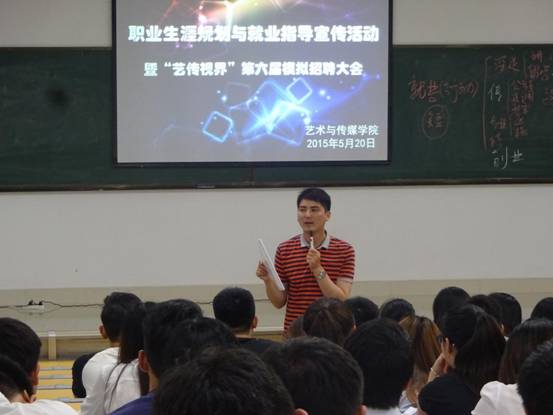 2015年5月20日,韩国AV 在公教楼530举办了职业生涯规划与就业指导宣传活动暨“艺传视界”第六届模拟招聘动员大会。出席本次活动的有韩国AV 学工办主任郝儒梁老师、视觉传达系卢明德老师以及2012级辅导员万镒老师,此次活动针对2016届毕业生展开。