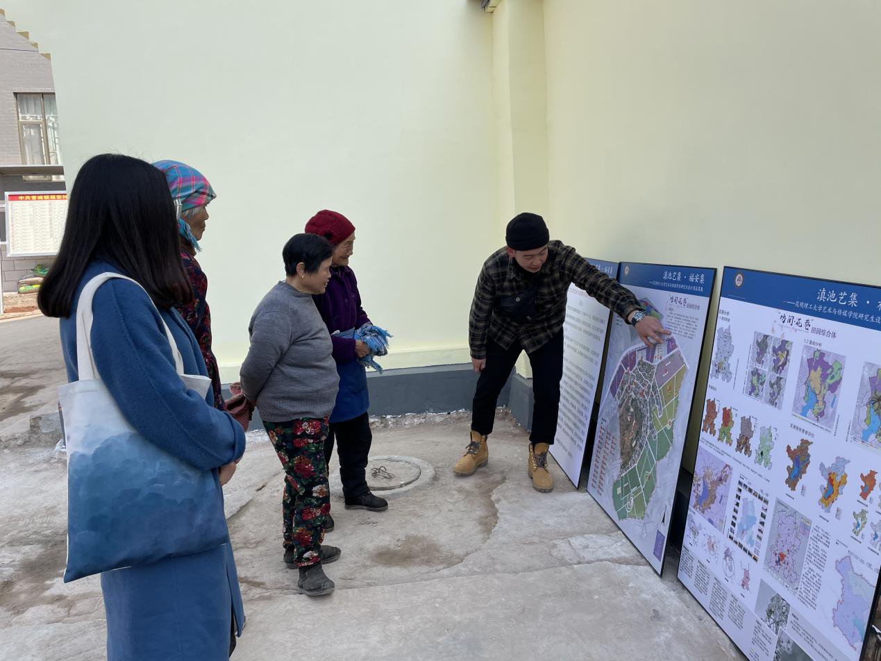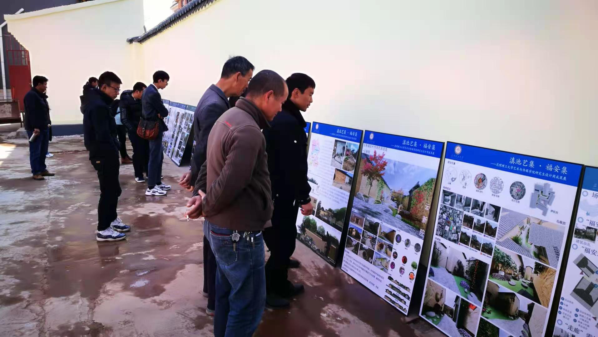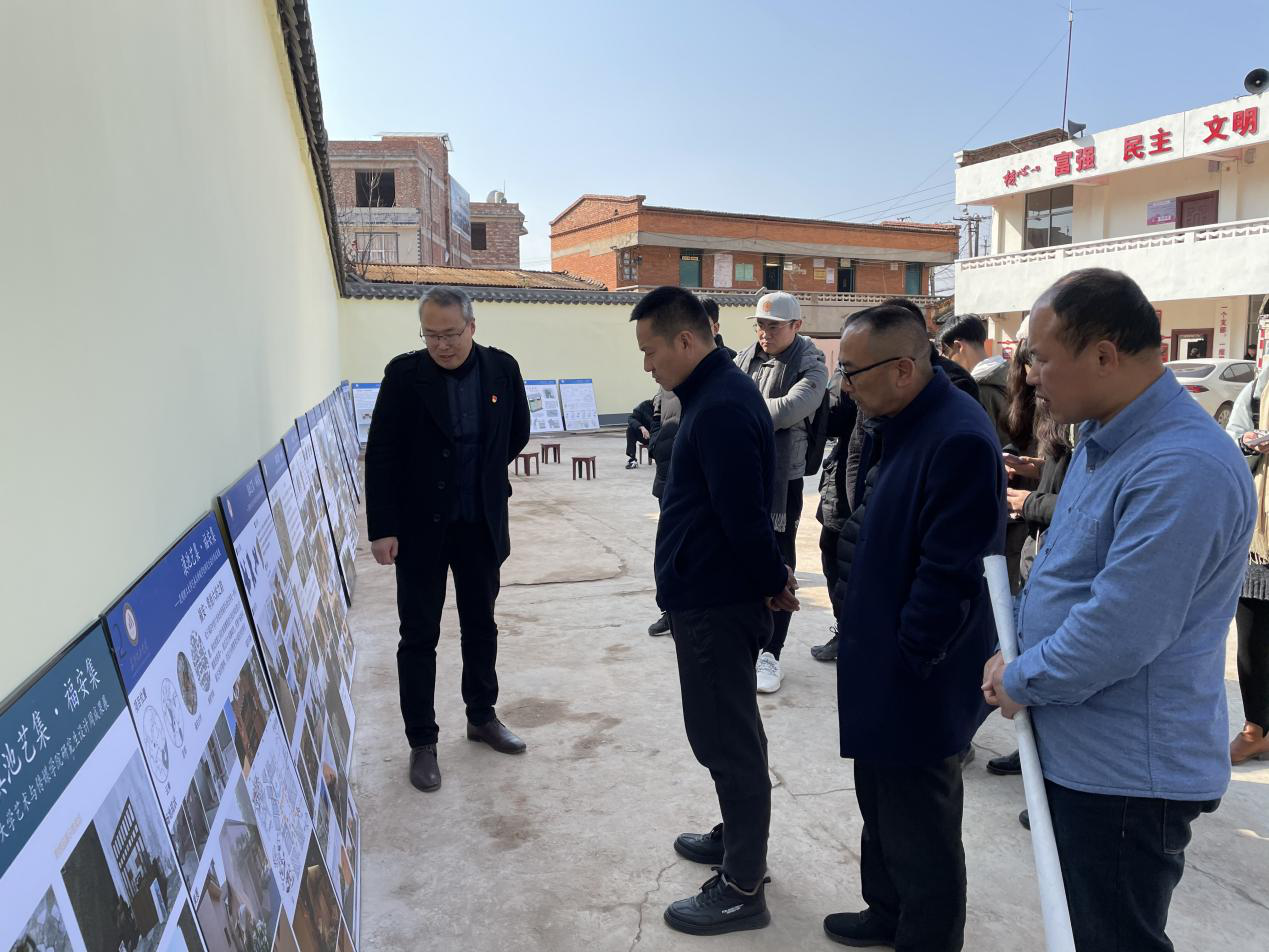 晋宁区区委副书记李松、晋宁区农业农村局局长刘洋、晋城镇党委书记吴志国、晋城镇党委副书记郑放明、副镇长陈兴洪和驻村工作队及村组干部共同参加了展览开幕式,并对展出的成果进行了认真观看,给出了高度评价。李松副书记等政府领导、村组干部和学校老师、同学在村委会大院里进行了深入的交流。李副书记指出,地方发展、尤其是乡村发展急需的正是高校的智力和人才优势,同学们通过此次设计周,展现了良好的艺术素养和专业精神,设计成果对地方建设有很强的借鉴意义。希望同学们能响应国家号召,认真发掘研究当地传统文化,融入到自己的设计作品中来,把为国家乡村振兴战略服务的理想信念落实在福安村、落地在设计实践中。并希望同学们今后能留在晋宁区创业,共同推动晋宁区经济社会发展迈向新高度。其它领导和村组干部也发表了各自对本次“滇池艺集·福安集”艺术设计周的意见和建议,大家都认为本次“滇池艺集·福安集”艺术设计周活动有效的推动了校地合作,希望能持续推进设计成果的落地、落实。