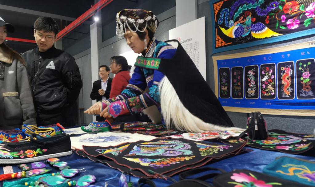 此次校园展分为“纵横经纬的艺术”和“云岭正当国潮时”两个主题,纵横经纬的艺术·云南民族民间织、染、剪、绣精品展展示了云南民间各民族纺织、印染、剪纸、刺绣,是弥足珍贵的民间文化遗产,从工艺流程到色彩的搭配,无一不承载着厚重的传统文化和民族精神。