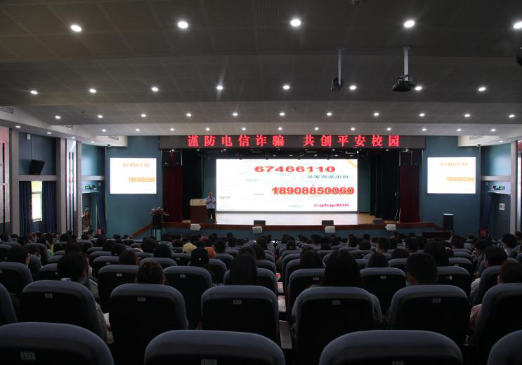 倪辉警官围绕“防范电信诈骗、防范‘校园贷’、‘套路贷’”等,向同学们介绍了近年来发生的电信诈骗典型案例,分析了常见电信诈骗的特点、类型、作案惯用手段,着重讲解了“校园贷”“套路贷”的诈骗方式,以及上当受骗后的处理办法。“借款网贷你帮忙,损失五万悔青肠。”“贷款不上银行,将来必定悔断肠”,配合着“辉哥”自己编的“防骗打油诗”,生动形象、诙谐幽默的表达方式和呈现,十分契合当代大学生的接受方式,给在场的学生们留下深刻的印象。