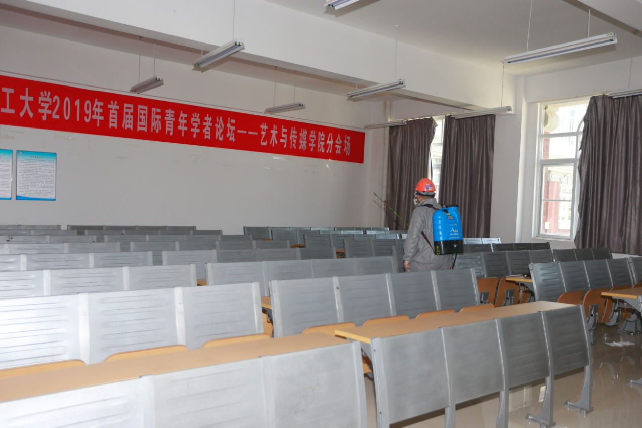 实展中心教师对学院公教楼内的机房、多媒体教室、专业教室、工作室和办公室等房间和场所进行了集中消毒作业,共计消毒房间40余间。