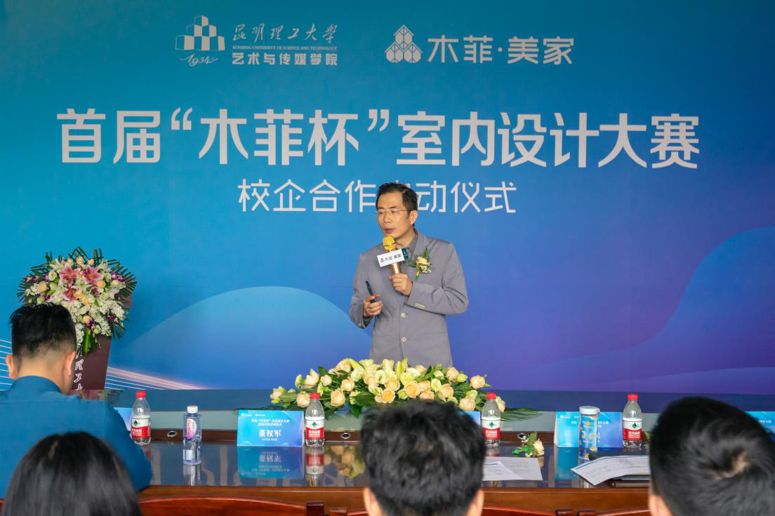 副校长周峰越老师致辞,他表示:“校企合作,可以充分发挥企业、学校各自优势,准确把握企业用人需求,同时为学生提前营造真实的工作氛围,本次‘木菲杯’室内设计大赛就是一个校企合作的成功体现,‘木菲杯’室内设计大赛的成功举办,将为学生们提供展现自我和实践的平台。”