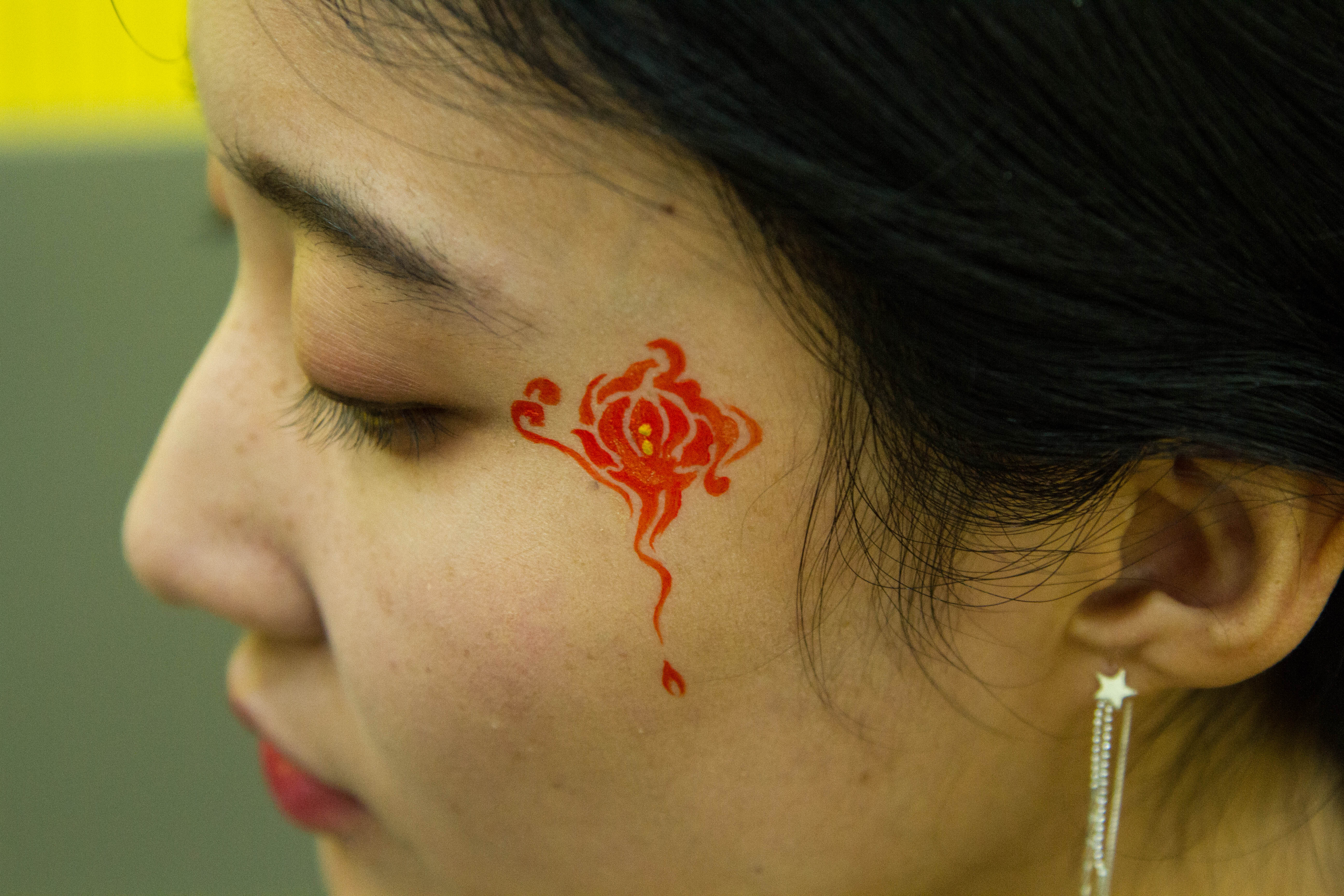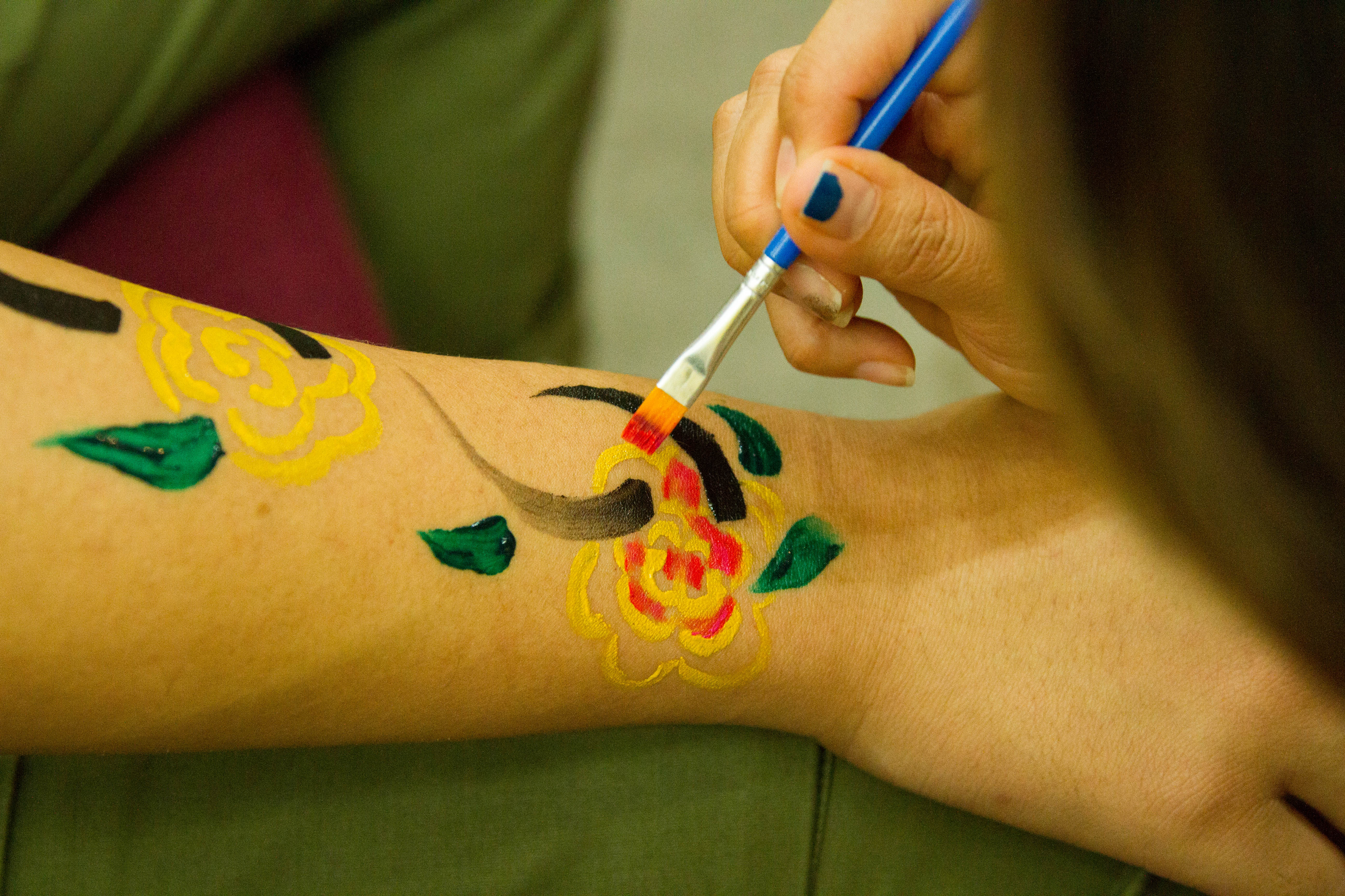 本次课专门选用人体彩绘无毒颜料和卸妆用品。上课班级的五位同学自愿报名作现场模特。教学过程主要通过专题介绍,PPT案例展示,课堂讨论,师生分组交流等环节,使大家对人体彩绘有所了解,并当场合作完成局部彩绘造型。最终,官鸿老师将中国传统的脸谱与现代艺术相结合,为陈治君同学创作出绚烂多彩的面部彩绘;李富娜老师为李鹂璞同学进行了手臂凤凰和面部牡丹的彩绘,又为孙琳钧同学绘制了锁骨部位的红色锦鲤;研究生刘文娇为贾芃洁同学在肩颈部位彩绘了一只惟妙惟肖的梅花鹿;梁劲芸老师依照廖发升同学的意愿,在其手臂上彩绘出一串花藤。其他同学在观看示范之后,大大增强了共同探索、相互练手的积极性。大家临时配搭,沟通合作,相互尝试在面部、颈部、手臂等局部进行了彩绘练习。课程现场还吸引了本院不同部门的多位老师前来观摩交流。
