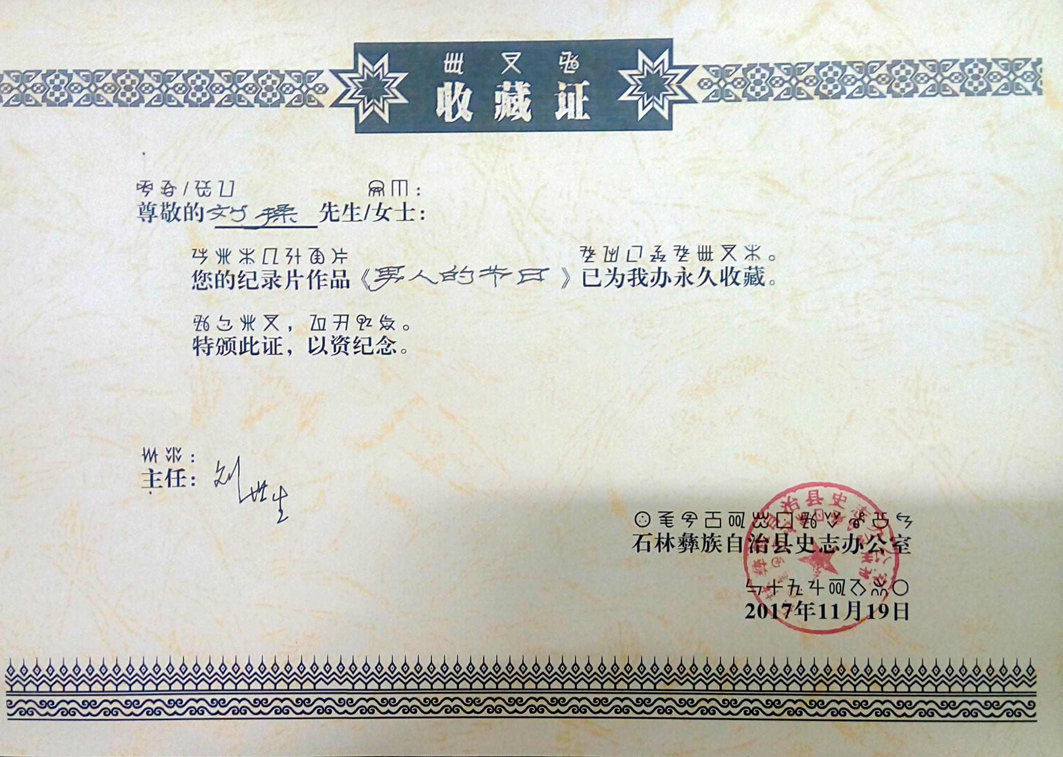 在影像展映环节,项目的阶段性成果,巴胜超老师指导的3部研究生毕业作品,包括谌舒雅的《行走的乐舞》、刘操的《男人的节日:彝族撒尼人“密枝节”影像记录》、田聪的《阿诗玛 回响》,被石林县永久收藏,丰富了石林的地方影像志资料。