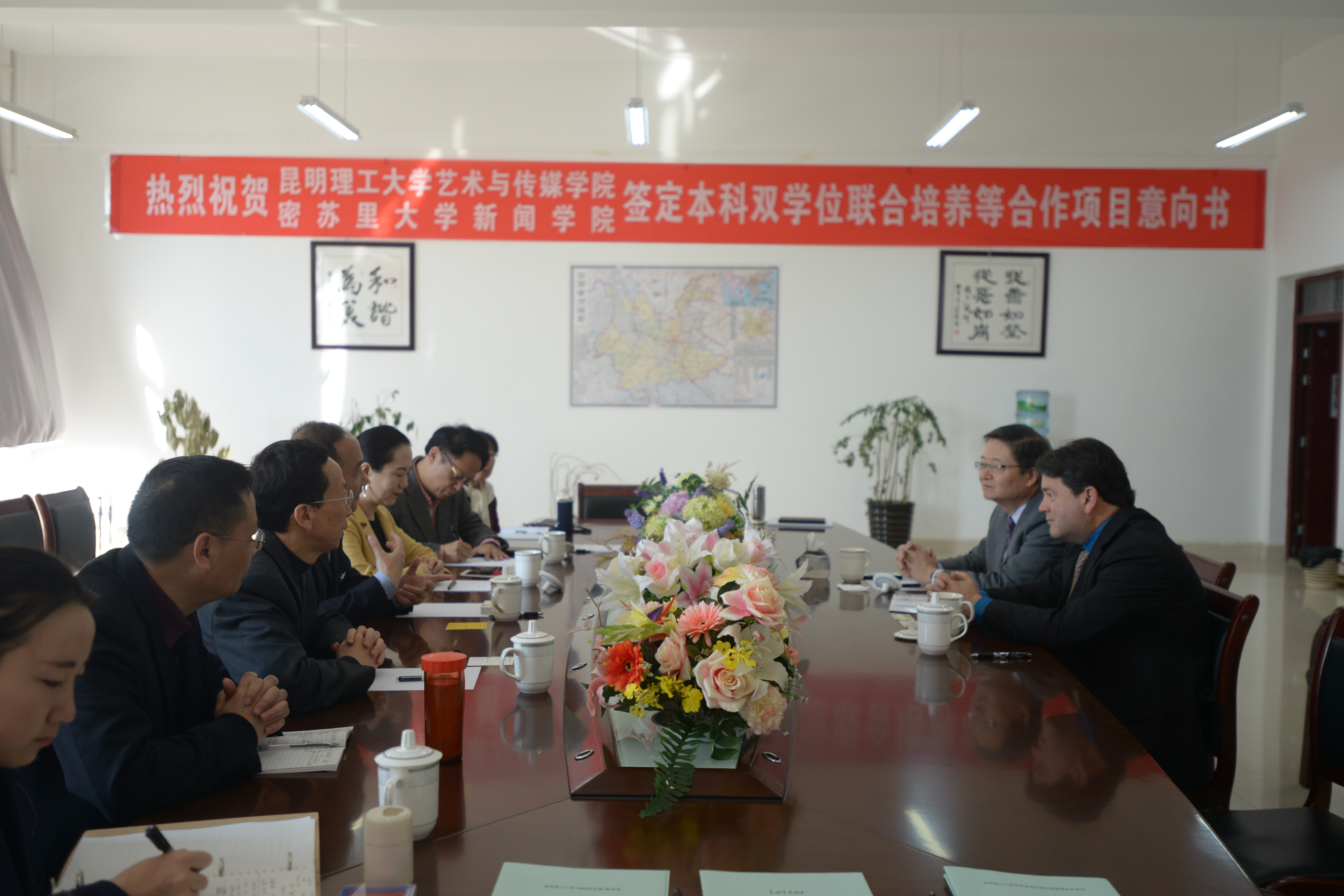 (简称昆明理工大艺传学院)成立于2009年9月,学院现有工业设计、产品设计、环境设计、视觉传达设计、数字媒体艺术、绘画、传播学、编辑出版学、广告学、播音与主持艺术等10个本科专业。密苏里大学新闻学院成立于1908年,是世界上第一所新闻学院,也是美国和世界上最优秀的新闻与传播学院之一。此次双方签署合作项目意向书,旨在通过两院间的跨国合作,鼓励两校学生积极参与交流合作项目,达到取长补短,提升双方的核心竞争力。