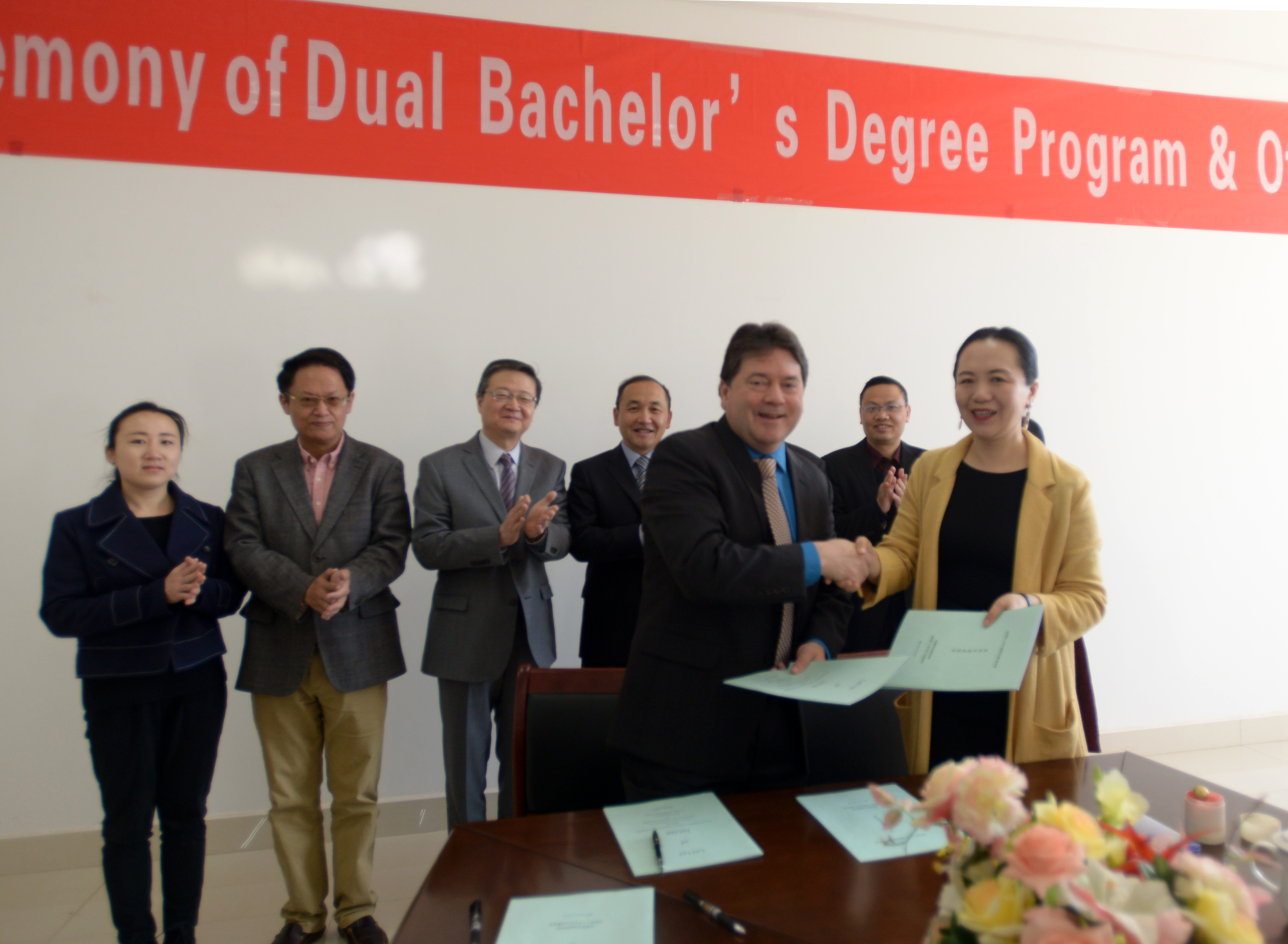 副校长周峰越博士、校外事处邓钢处长、密苏里新闻学院环球项目中国合作项目主任章于炎博士等见证双方签约。