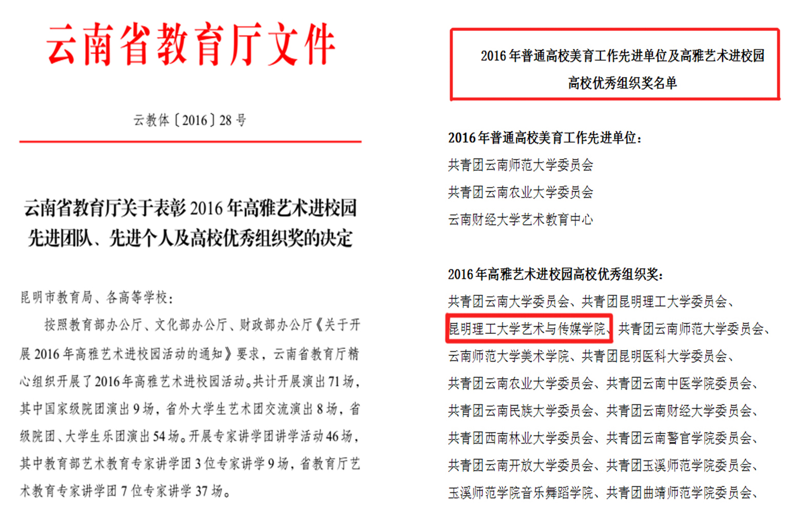 在2016年底,云南省教育厅发布了云教体28号文件,表彰了2016年高雅艺术进校园的一批先进团队、先进个人及高校优秀组织单位,韩国AV 荣获“2016年高雅艺术进校园高校优秀组织奖”。