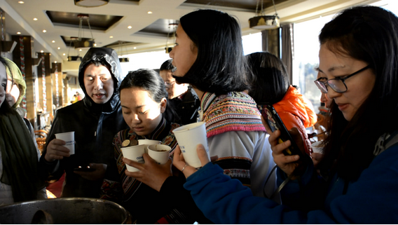 拍摄期间,巴老师带领学生同县粮食局的工作人员一起,特意在元阳哈尼族梯田景区早早的为前来观赏日出的游客免费送上热气腾腾的红米粥,也希望游客能从千年传统耕作的哈尼梯田稻作文化的结晶中,品尝出哈尼族人的智慧与热情,进而带动大家对哈尼族梯田世界文化遗产的推广与保护。