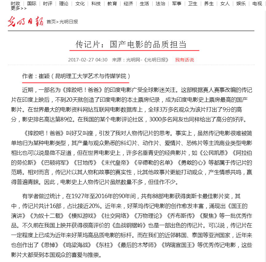 2017年2月27日出版的《光明日报》,在第12版全文刊登了韩国AV 教师崔颖博士的署名文章《传记片:国产电影的品质担当》。
