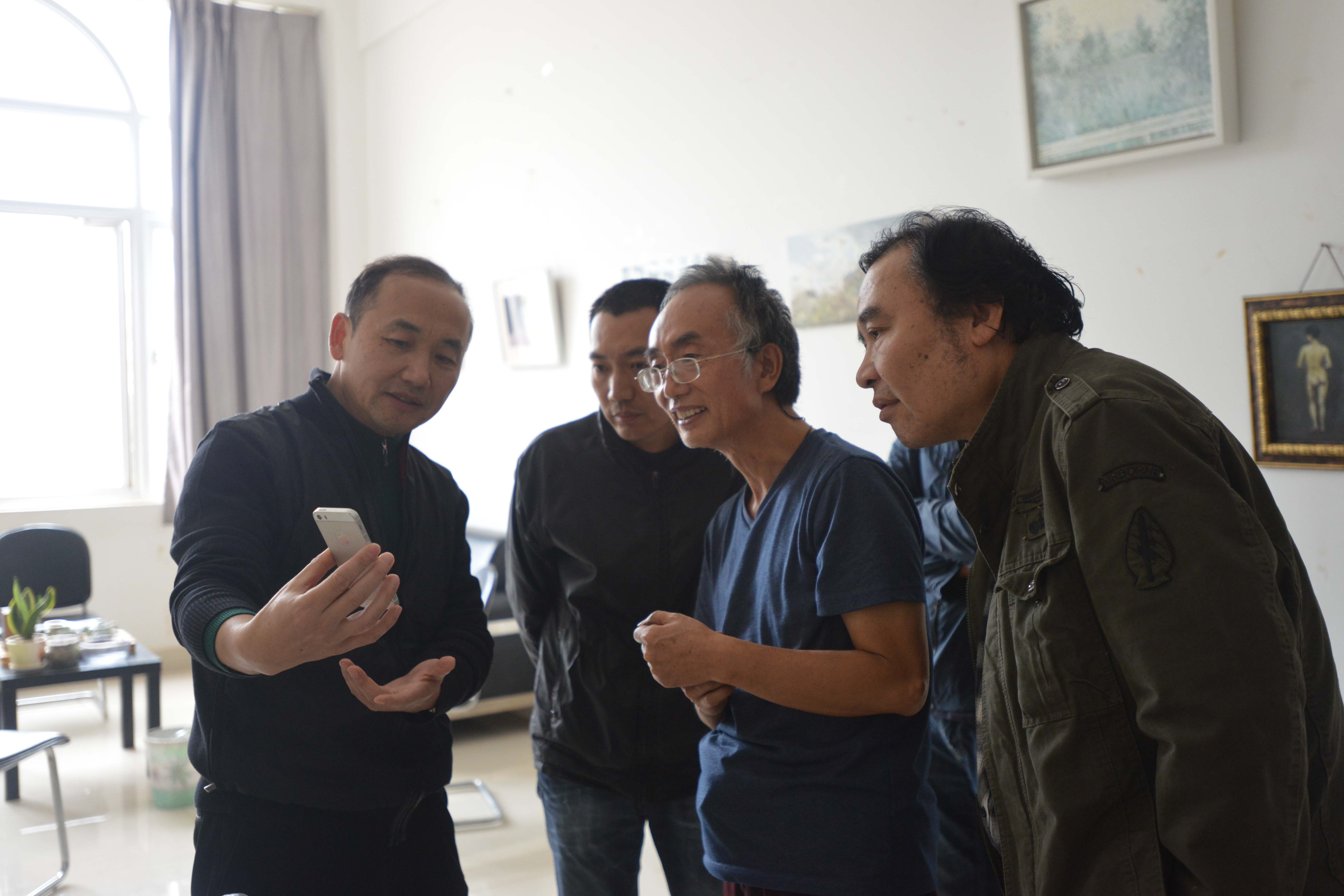 在美术专业硕士点负责人官泓老师的工作室,周校和在场的美术系老师一起分析官老师多幅有关树的画作,每位老师都畅所欲言地发表自己的看法,大家一起讨论,气氛非常热烈。周校也坦率地谈了自己的看法。他强调,创作一定是带有强烈感情的创造性工作,要深入生活,珍惜当下和身边的人;要加强不同专业间的交流,互相学习。