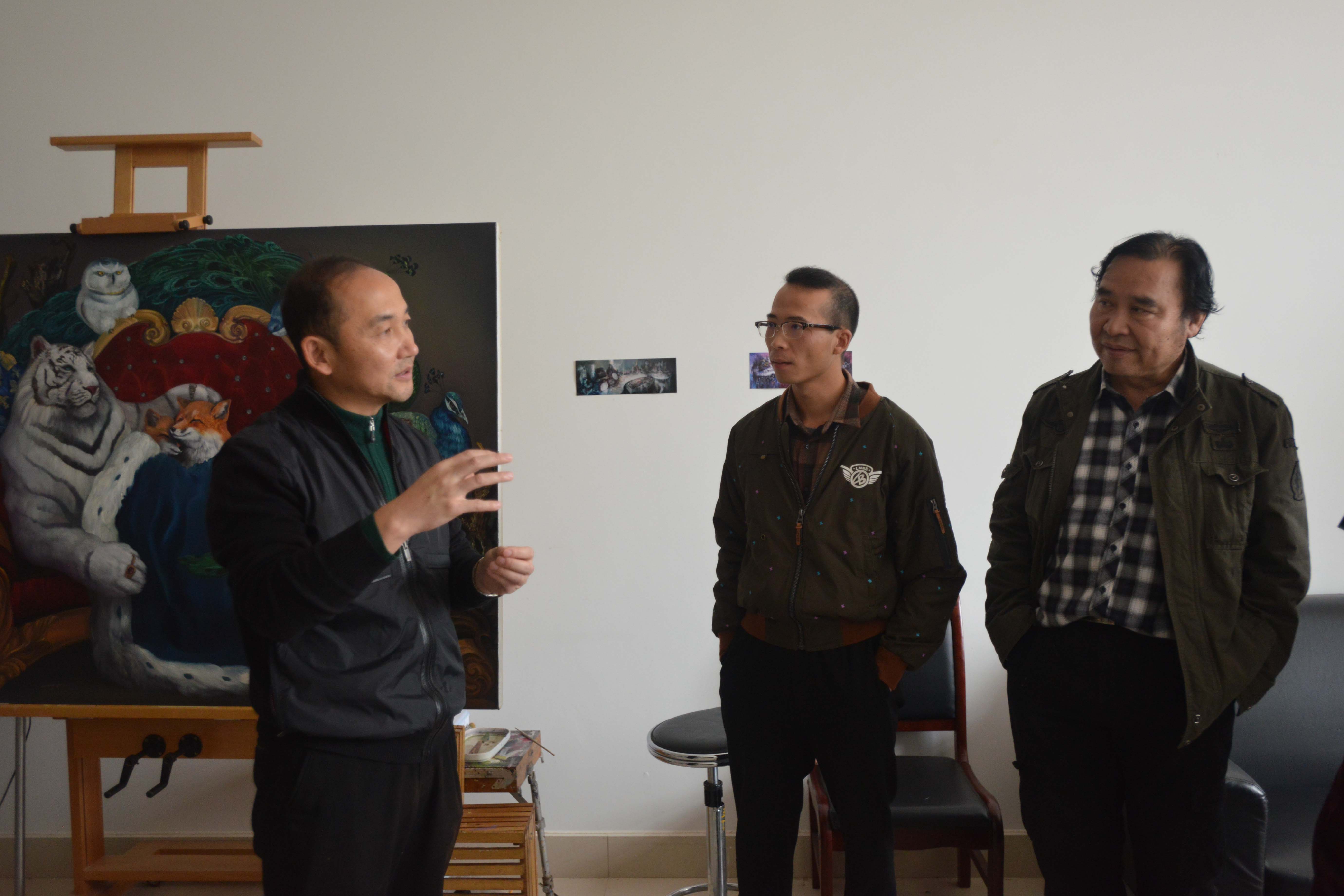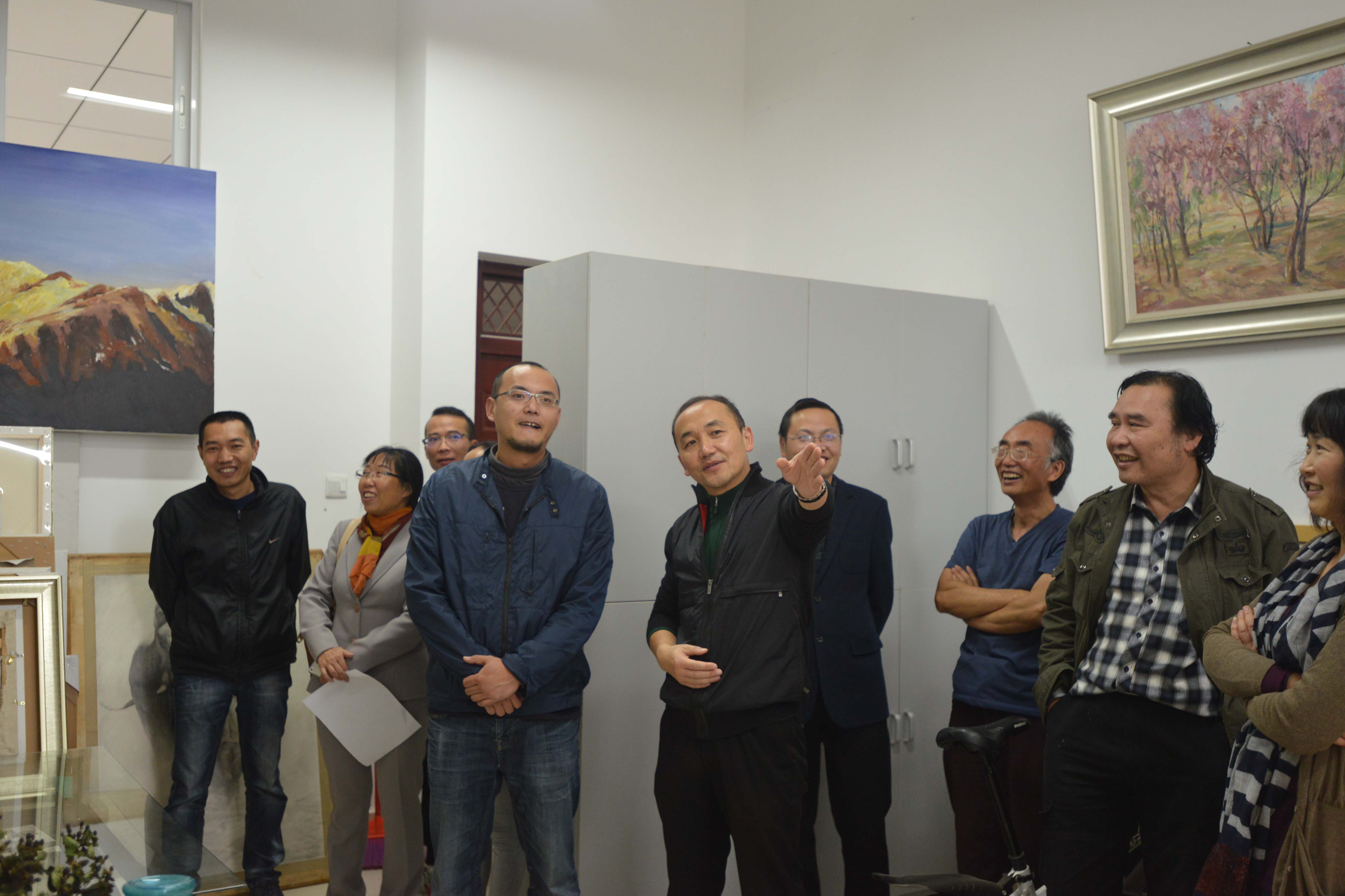 在赵刚老师工作室,周校和老师们一起探讨如何让学生准确把握国画、油画的学习方法,建议多临摹经典名作打牢基本功,不受差作品的污染,增强以后步入社会的竞争力。