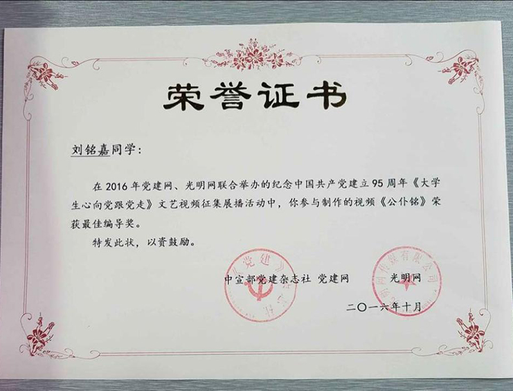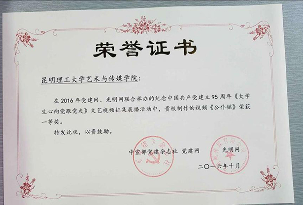 广播电视艺术专业研究生刘铭嘉、陈右、余昌宇、孙亮等一起创作的视频作品《公仆铭》荣获一等奖,刘铭嘉同学还荣获最佳编导奖,为我校争了光。