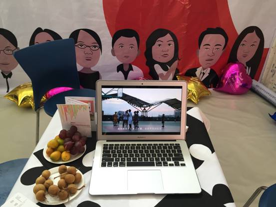 参加博览会的师生精心布置了我校展区,灵感突显的五彩手印密布在展厅一墙,渲染出学校、学院多彩的文化气息;展厅内特色形状气球围绕展板,多姿绚丽;手折的纸飞机和云彩环绕上空,似有放飞梦想、想象无限之意,充分展现青年学子青春活力的形象和新鲜独特的创意文化。