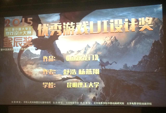 首次组织作品参赛就取得了优异成绩。2013级艺术设计专业研究生舒浩、杨燕翔作品《鱼跃龙门》荣获了优秀游戏UI设计奖;2015级设计学专业研究生张蓉作品《彝鱼冒险记》、艺术设计专业研究生郭悦作品《昆明山海经之龙九子》荣获了优秀学生作业奖;视觉传达设计系主任喻丽老师荣获优秀指导教师奖。
