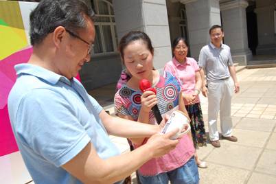 视传系2011级钱娟同学以昆工60年校庆为主题,自行设计了“昆工60年人物纪念”系列作品,给学校很多老师都设计、定制了专门的纪念品,其中就有周书记的,听说周书记要来学院,她就把这个精美的设计作品赠给了周书记。作品是个精巧的杯子,杯子外侧以周书记的肖像为主体开展设计。周书记看后很高兴地收下了这个礼物。