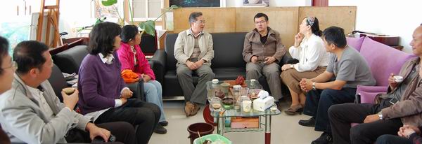 随后,周书记一行走访了学院的导师工作室,先后到李晓弟工作室、官泓工作室、朱海昆工作室与老师们亲切交谈,深入了解学院一线教师的工作环境、工作状况。在官泓工作室,周书记一行同教师一起,一边品茗普洱茶,一边详细询问工作室的硬件配置情况,与省内同行相比学院教师教学、创作条件的情况,学院领导对教职工的关怀情况,教师个人教学、创作及职业发展情况,周书记还亲切询问老师们对学院、学校的意见、建议。