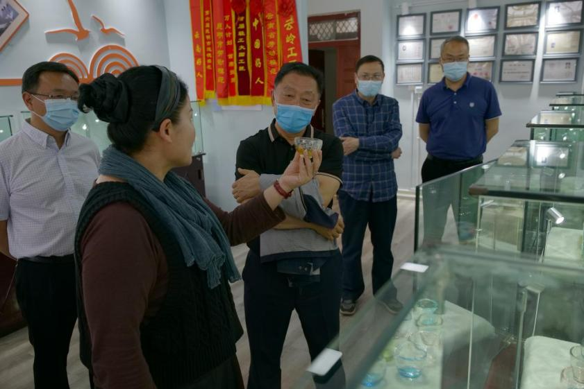 陶书记一行首先走访了“大国工匠”孙鸿雁老师的“内画与琉璃工作室”。孙老师向陶书记介绍了内画作品的制作工艺、颜料运用以及工作室的管理制度。