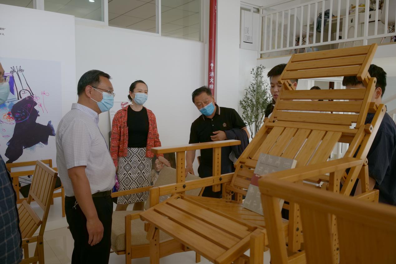 工业设计系工作室,观看并体验了田野副教授的框架椅系列作品。陶书记对工业设计系的科研成果给予了充分肯定,并对学科发展提出了宝贵的意见。