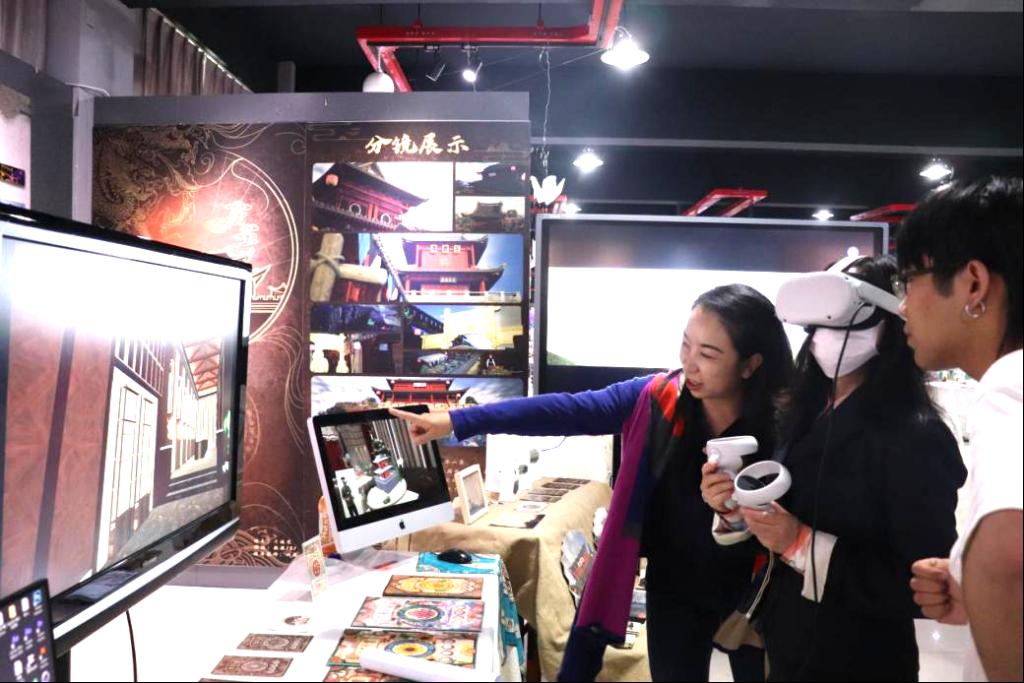 张英杰书记边参观学生的毕业作品,边询问学生有关毕业作品的创作理念,创作过程,应用环境等等,并与指导教师就人才的培养进行了细致的交流,还亲身体验了数字交互VR虚拟与现实技术作品。