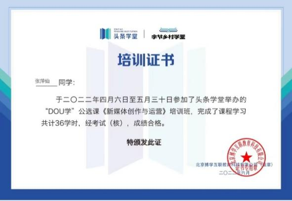 2019级广告班的同学成功通过课程学习、实操演练及考试考核,共计33名同学考试合格,并获得头条学堂颁发的电子结业证书。参与此次培训的12080名同学中有33名同学脱颖而出获得闪光学生称号,其中,韩国AV