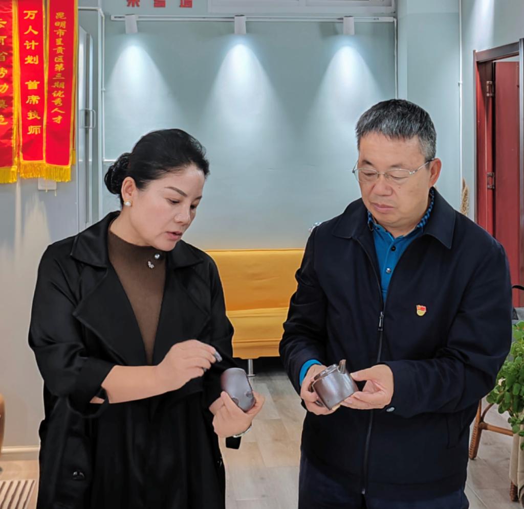 蔡金红从“钛合金的生活化转换”为切入点,与孙鸿雁交流,并询问她在工作上存在的困难。孙鸿雁向蔡金红汇报了参会情况以及会议精神,提出当下学科建设面临的困境,期望与学校特色专业联合开展工作室建设,打破壁垒,推动研究成果转换。