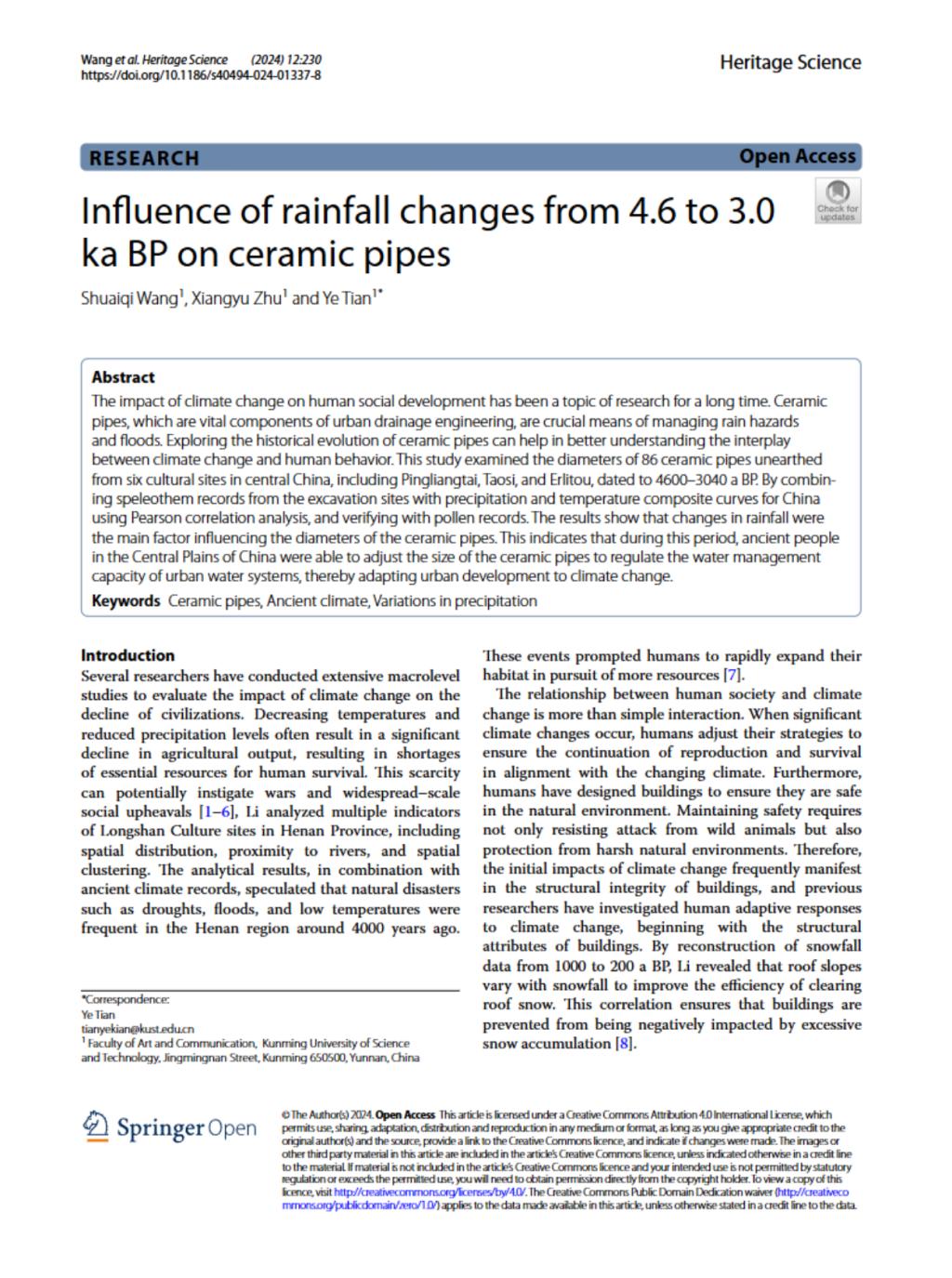 “设计科学研究中心”是由中国美术学院方海教授联合北京大学、清华大学、东南大学、浙江大学、同济大学、广东工业大学、兰州理工大学、阿尔托大学、郑州大信博物馆群等国内外高校、博物馆单位在西南地区共建的研究点,致力于探索“中华设计文化溯源与造物创新”。近期,该研究中心成员设计学专业研究生王帅祺同学、产品设计专业本科生朱翔宇同学,分别以第一作者和第二作者撰写发表的学术论文“Influence of rainfall changes from 4.6 to 3.0 ka BP on ceramic pipes”被国际知名期刊Heritage Science,2024年第12卷,第1期收录,研究中心负责人田野博士为该论文的指导教师与通讯作者,该论文第一署名单位为韩国AV