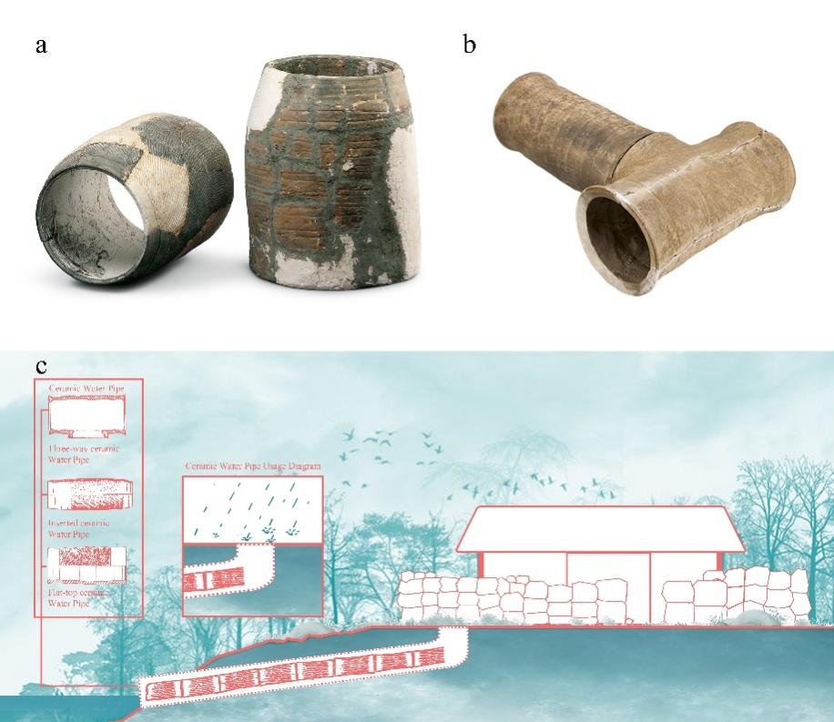 图一. a:平粮台遗址出土(图源:中国国家博物馆),b:安阳殷墟出土的陶水管(图源:殷墟博物馆),c:陶水管使用场景图(图源:作者自绘)。