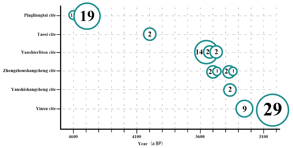 图三.不同遗址出土陶水管数量和年代示意图。