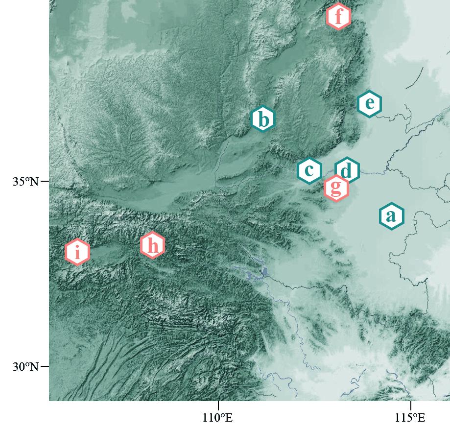 图二.陶水管出土遗址和石笋记录采集地示意图,(a)平粮台遗址、(b)陶寺遗址、(c)偃师二里头遗址、偃师商城遗址、(d)郑州商城遗址。(e)安阳殷墟遗址、(f)山西省莲花洞、(g)河南省马沟洞、(h)陕西九仙洞、(i)陕西祥龙洞。绿色为陶水管出土遗址所在地,红色为石笋记录采集地。(地图来源:自然资源部& NavInfo审图号:GS(2024)0568号)