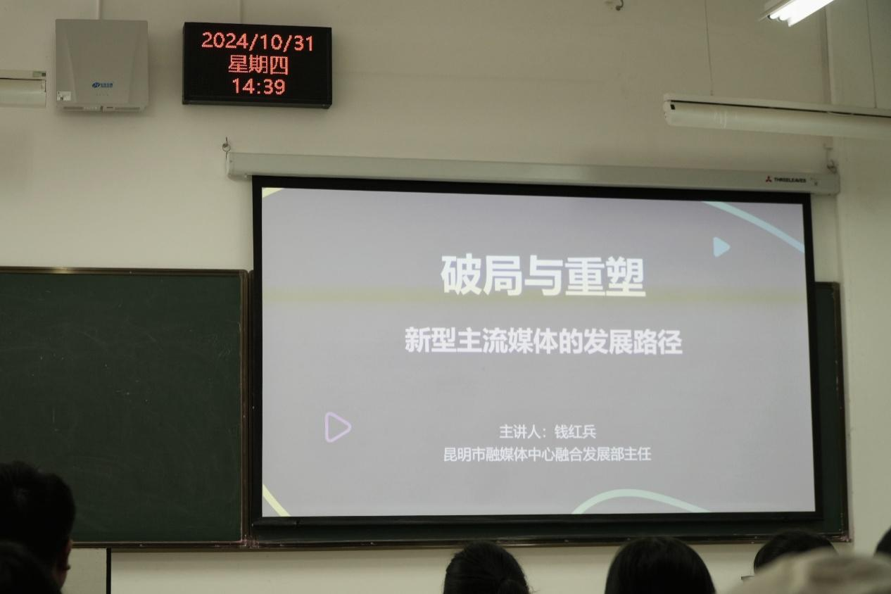 举办的“七秩昆工”校庆系列讲座——明德社科大讲坛在公教楼424教室举行。昆明市融媒体中心融合发展部主任钱红兵担任主讲嘉宾,以《破局与重塑——新型主流媒体的发展路径》为题,为师生带来一场精彩讲座,新闻传播系系主任李昌教授主持讲座。