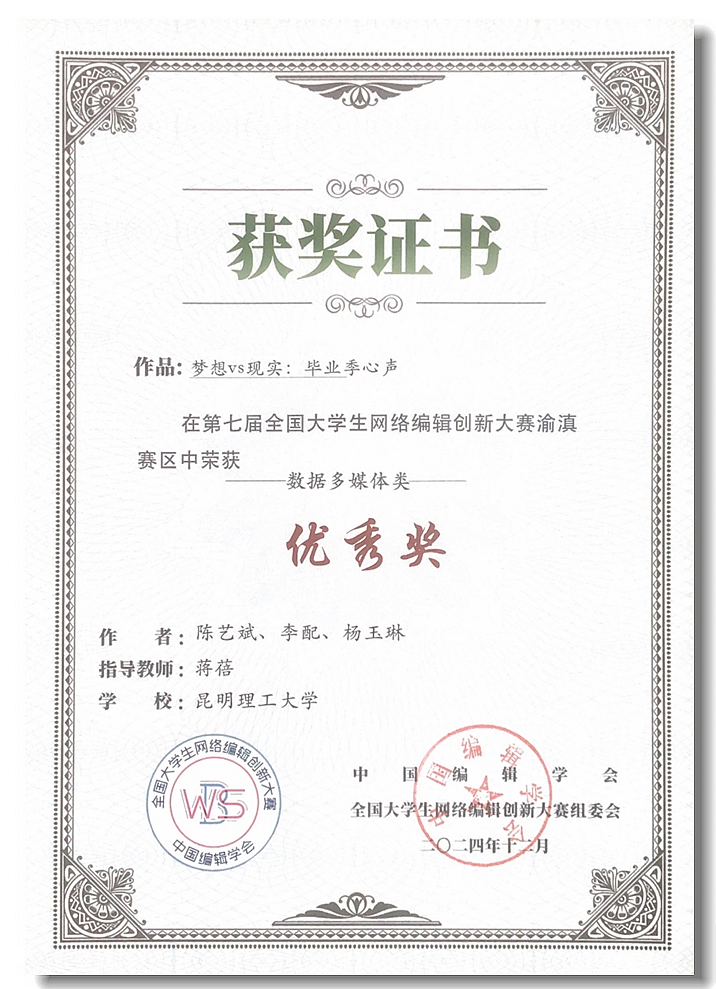新闻传播系7位学子凭借风格化的融媒体作品,在“视听新媒体类”和“数据多媒体类”赛道中脱颖而出,荣获全国奖项及渝滇赛区奖项。其中,全国优秀奖作为云南高校新闻传播学类专业唯一获得的全国性奖项,凸显了该系学子的专业能力与创新精神。