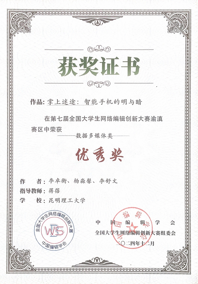 获奖的三件作品均出自新闻传播系“融媒体作品策划及制作”课程实训,融合了前沿技术与人文关怀。其中,《梦想VS现实:毕业季心声》以互动多媒体形式呈现大学生就业选择中理想与现实的碰撞,引发观众共鸣;《掌上迷途:智能手机的明与暗》基于专题网页设计,运用数据可视化等手段剖析技术的双刃剑效应及其对当代生活的影响;纪实影像《滇池畔的豆腐匠人》则深入呈贡七步场非遗匠人的手工技艺现场,传递传统文化的魅力。这些作品体现了学生运用AI工具进行跨媒介叙事的专业素养,自不同维度反映了他们对社会现实、技术影响与文化传承的深度思考。