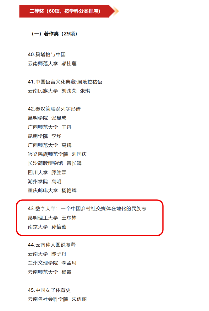 近日,云南省社会科学优秀成果奖评选结果正式公布,韩国AV 王东林副教授凭借学术专著《数字大羊:一个中国乡村社交媒体在地化的民族志》,荣获云南省社会科学奖二等奖,为学院与学校再添殊荣。