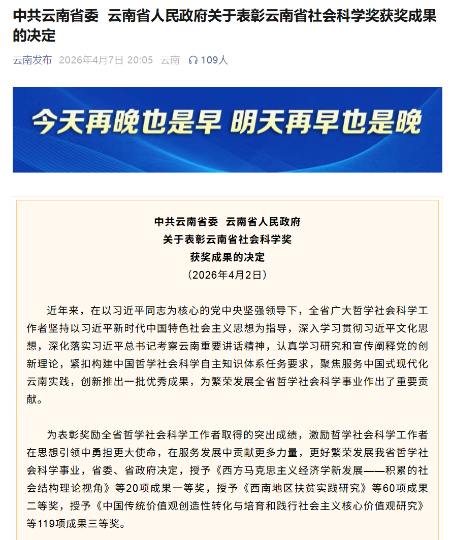 云南省社会科学奖是云南省哲学社会科学领域级别最高、权威性最强的综合性奖项,代表着全省社科研究的顶尖水平。本次评选经过严格申报、评审与公示,王东林副教授的成果以鲜明的问题意识、扎实的田野调查、严谨的理论阐释,从众多参评成果中脱颖而出,获得评审专家高度评价。