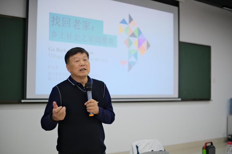 彭老师引用费孝通、梁漱溟关于中国社会乡土性的论述,告诉大家:乡村建设是一个宏伟的时代命题。“乡村兴则国家兴,乡村衰则国家衰。”中国绝大多数人都源于乡村,而我们如今已经逐步丢失了对乡土的根脉认知。接着,彭老师从“家园的表情”“景在五行中”“被加速的乡村旅游景观”“找回老家”等维度,和同学们分享了他关于“重建中国乡土景观”的研究心得。