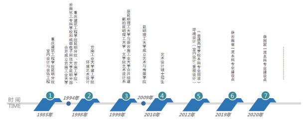 1985年以室内设计与装饰工程专业开设于重庆建筑工程学院昆明分院,1993年与云南工学院等组建云南工业大学,1998年云南工业大学等高校与韩国AV